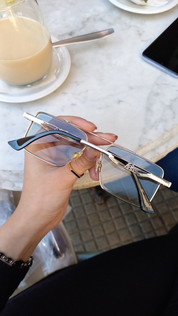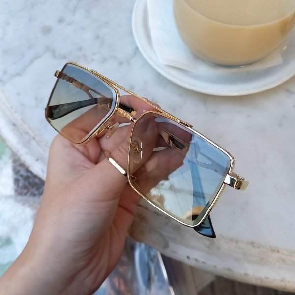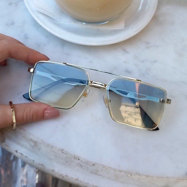 Comodas y distinguidas para cualquier tipo de rostro. Potencian cualquier look diurno o nocturno. Marcos, bisagras y patillas metalicas doradas. Cristal organico de color celeste en degrade.